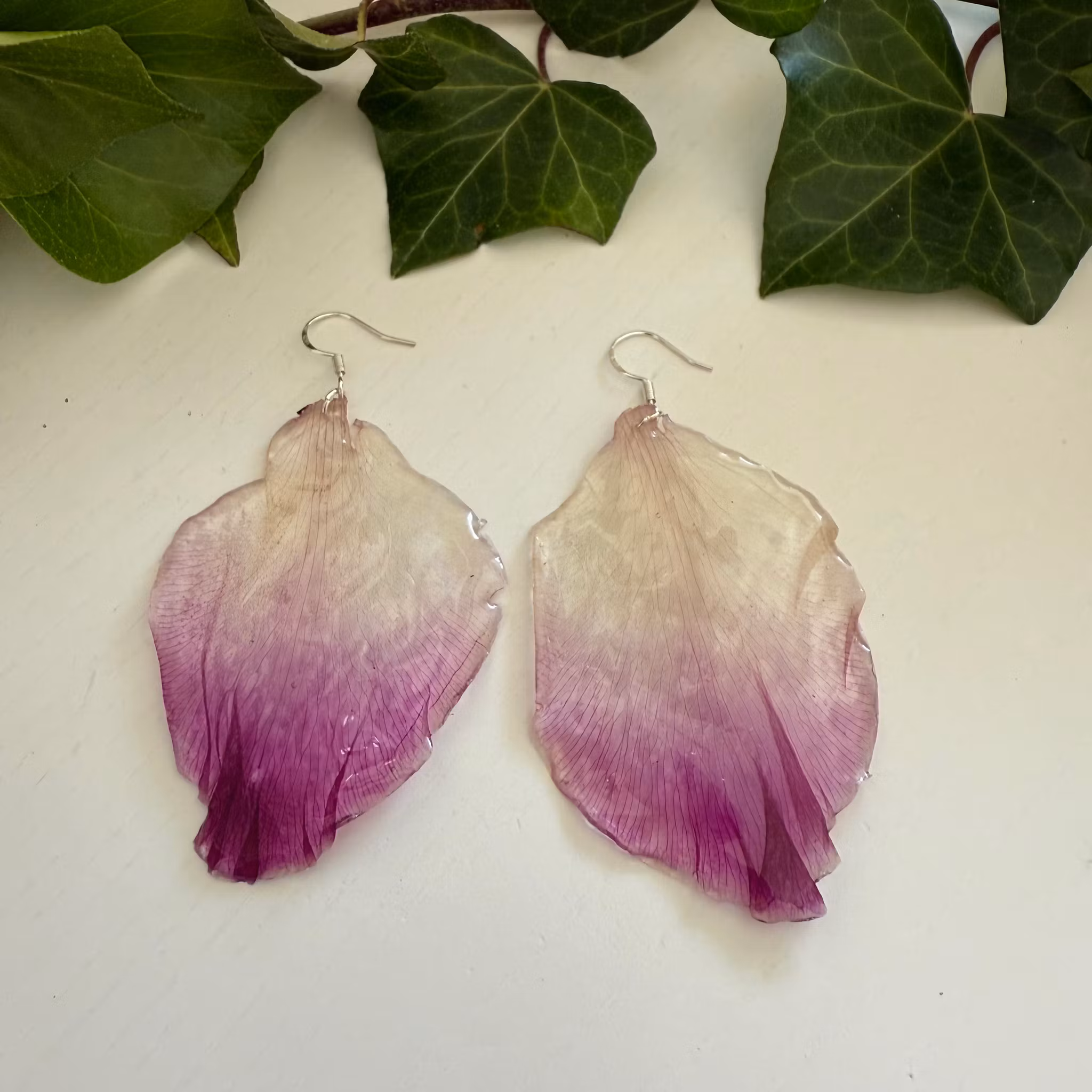 Blad från Gladiolusblomma. Ca 5,5 cm stort utan krok. Krok i äkta silver.