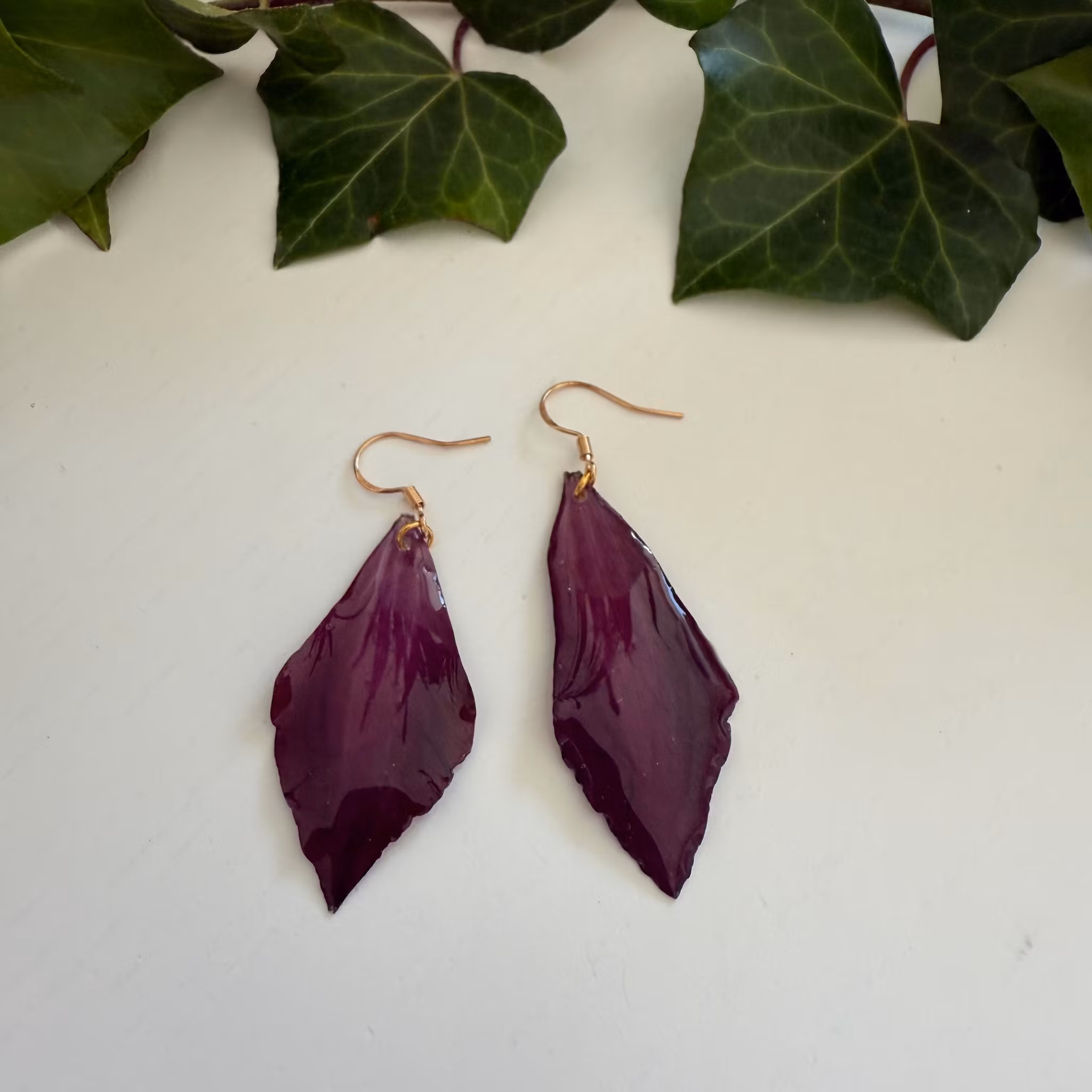 Blad från rosa Klematis, nu vinröd. Krok av äkta silver, roseguldfärg. Ca 3 cm.