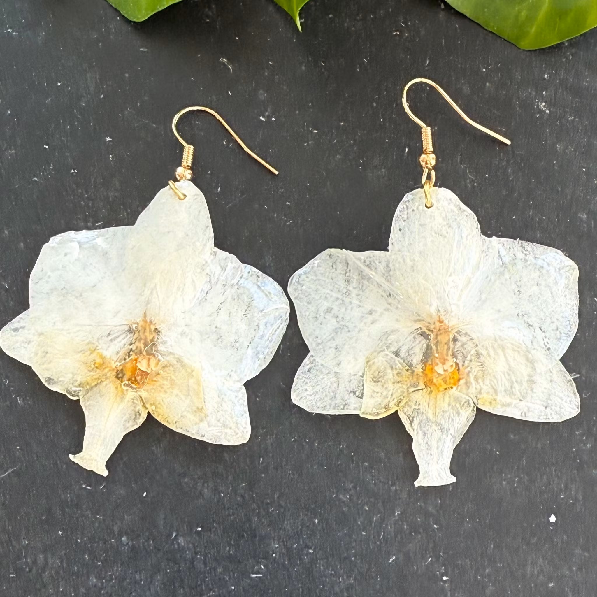 Vit brudorkidé. Ca 4,5 x 4,5 cm. Rostfritt stål, gulfärgad.