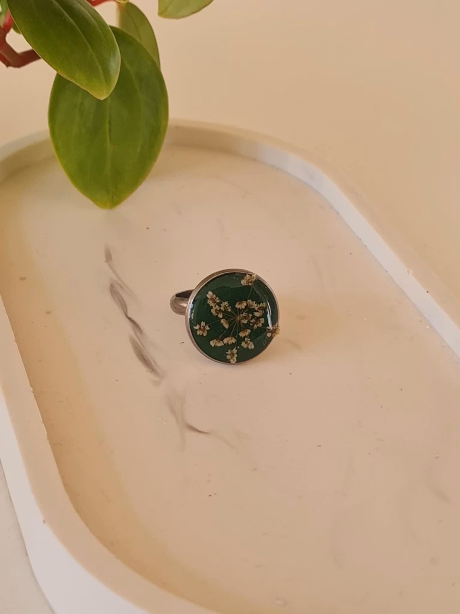 Ring i rostfritt stål med torkad blomma i. Ringen är justerbar i storlek.
